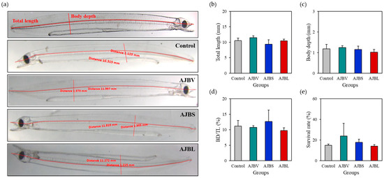 The growth and survival rates of eel larvae supplemented with the artificial diet for 30 days are shown in Figure 2. The average total length (TL) of eel larvae was 10.44 ± 0.87 mm with no significant differences (p > 0.05) among the groups. Similarly, there were no significant differences in mean body depth (BD, average 1.15 ± 0.09 mm) and TL/BD values (average 11.11 ± 1.23%). Regarding survival rates, the AJBV group (24.00 ± 12.16%) increased compared to controls (14.90 ± 1.27%), but no significant differences were observed. Survival rates of the AJBS and AJBL groups were 17.80 ± 3.11% and 14.10 ± 1.56%, respectively, and there was no significant difference compared to the controls (Figure 2e).