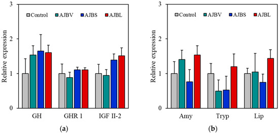 Gene expression profiles of eel larvae fed a diet containing host-associated Bacillus species (AJBV, Bacillus velezensis; AJBS, B. subtilis; AJBL, B. licheniformis). Comparison of gene expression 30 days after hatching was determined by RT-qPCR analysis. Levels of (a) growth (growth hormone, GH; growth hormone receptor 1, GHR 1; insulin-like growth factor II-2, IGF II-2) and (b) digestive enzyme (amylase, Amy; trypsin, Tryp; lipase, Lip) relative gene expression were quantified relative to β-actin transcription. The data are represented as the means ± standard deviation of three replicates (5 fish/replicate).