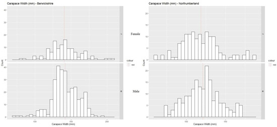 Carapace width (mm) of the Berwickshire (n = 437; (Males = 313, Females = 124)) and Northumberland (n = 332; (Males = 188, Females = 144)) C. pagurus sampled cohorts. The red dotted line highlights the mean carapace width (mm) for each population separated by sex.