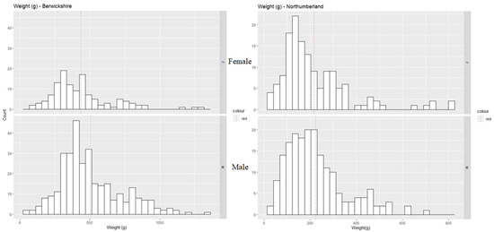 Wet weight (g) of the Berwickshire ((n = 437); (Males = 313, Females = 124)) and Northumberland ((n = 332); Males = 188, Females = 144) C. pagurus sampled cohorts. The red dotted line highlights the mean wet weight (g) for each population separated by sex.