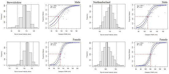 Physiological maturity () was considered using the maturity stages three for males and three–four for females. Following the logistic regression with bootstrapping, it was considered that the size at which gonadal maturity was met for 50% of the population to be 108.5 mm (95% CI, 97.7–116.4 mm) for males in Berwickshire and 109.9 mm (95% CI, 105.9–113.5 mm) for those in Northumberland (Figure 5. For females, this was 126.8 mm (95% CI, 122.2–130.9 mm) in Berwickshire and 120.8 mm (95% CI, 117.2–125.3 mm) in Northumberland (Figure 5). In both regions, the females showed maturity at larger carapace widths when compared to males. Considering the ogive results, the C. pagurus in the Northumberland district would be mature at the current MCRS of 130 mm, and the same for the C. pagurus cohort from Berwickshire under the current Scottish MCRS of 150 mm.