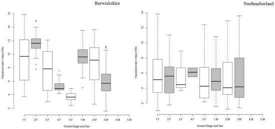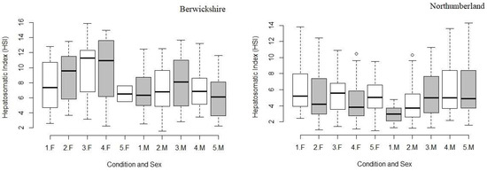 The HSI values for the Berwickshire-sampled individuals showed significant difference by gonad maturity stage (F-value = 61.83, p < 0.05), sex (F-value = 23.93, p < 0.05), and gonad stage as a covariate with sex (F-value = 11.78, p < 0.05). Contrastingly, the HSI for the individuals sampled from Northumberland showed no significance for gonad stage (F-value = 0.25, p = 0.90), sex (F-value = 0.78, p = > 0.05), or as covariates (F-value = 0.02, p = 0.97). Further results indicated that the HSI of the gonad stages one and two are significantly different to all other gonad stages (p < 0.05). There was a significant difference between gonad stages five and three (p = 0.01). Differences found between covariates indicated that gonad stages one and two in males showed significant difference to the female gonad stages two, four, and five (p < 0.05). Male gonad stage three showed significant difference from female gonad stage two (p < 0.05). The condition of the individual was shown to affect the HSI of the individuals (Anova, F-value = 5.80, p < 0.05), in particular that condition stage three was significantly different to stages one and two (Tukey HSD, p < 0.05). As covariates, condition and sex did not seem to affect the HSI value (Anova, F-value = 1.12, p = 0.34). This considers those sampled from Berwickshire (Figure 7), as for those in Northumberland (Figure 7) the opposite occurred, as covariates condition and sex affected the HSI significantly (Anova, F-value = 6.00, p < 0.05). Condition stage one in males was significantly different for condition stages four and five (Tukey HSD, p < 0.05). Condition stage four was significantly different to stage two (Tukey HSD, p < 0.05) for males. The HSI values were also significantly different between the first condition stages in males and females in Northumberland (Tukey HSD, p = 0.02). As separate factors, condition (Anova, F-value = 1.62, p = 0.16) and sex (Anova, F-value = 0.32, p = 0.57) did not affect HSI in Northumberland.