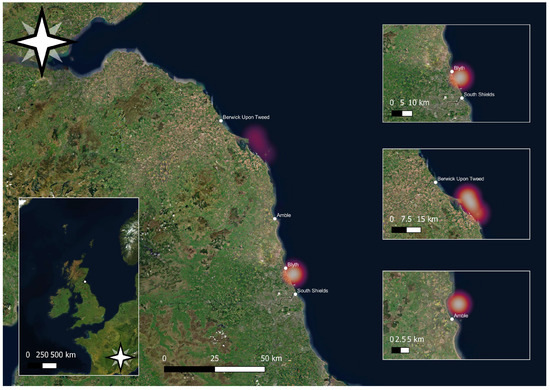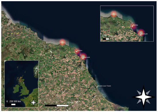 During 2020, there were 62 active creel fishing vessels (<10 m in length) operating from Eyemouth harbour (55.873726, −2.086900) [6], 75 active vessels in Northumberland, and 11 active vessels (based in Scotland) operating on both sides of the border [2,6]. Landings and effort data are available for 2020; however, COVID-19 restrictions that were in place for 2020 likely affected the fishing effort and landings for this period and therefore are unlikely to adequately represent the region as a whole. In 2020, the C. pagurus fishery for Berwickshire was valued at GBP 567,000 and GBP 2.13 million within the Northumberland region, highlighting the economic importance of this fishery to these regions [2,6]. C. pagurus landings data for the Berwickshire region and Northumberland region can be seen for 2017–2019 in Table 1.