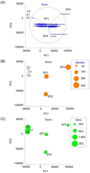 - Garibay-Valdez, E.; Martínez-Córdova, L.R.; López-Torres, M.A.; Almendariz-Tapia, F.J.; Martínez-Porchas, M.; Calderón, K. The implication of metabolically active Vibrio spp. in the digestive tract of Litopenaeus vannamei for its post-larval development. Sci. Rep. 2020, 10, 11428. [Google Scholar] [CrossRef]