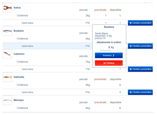 The VirMa application was developed by the SDT using FileMaker© software (Claris International Inc., version 18; Cupertino, CA, USA). As the first step of the co-designing process, the application, based on the specific profile, was able to run both on smart devices, such as smartphones and tablets, and on personal computers. The “portability” of the application was a prerequisite specifically expressed by SSF operators. Each profile was generated by an administrator, who created the account based on user groups. The user groups were identified as fishers, restaurants, and private buyers. Each profile had specific privileges. To increase the awareness of buyers (restaurants and private ones), as explicitly asked by their representatives in the WG, specific information related to each fisher’s profile was added. Such information was, of course, associated with the fisher’s identity, the name and picture of the boat, the boat code, and the registered harbor (Figure 1). During each fishing day, fishers could add a fishing session that was automatically generated, based on the calendar day. As requested, a pre-charged list of species was added to the application to facilitate the fishers’ input, decreasing as much as possible the number of clicks needed (Figure 1). For each species, the fisher could insert the gear used, the catch amount, and the price. The price policy was left totally free to mimic the actual market, and each operator could choose the best price fitting with his daily catch; nevertheless, the SSF operators agreed to visualize the minimum and the optimal price suggested for each species. This price fork was established according to periodical consultations with fishers about prices and was expressed as mean value (Figure 1). All the inputs uploaded to the VirMa application by fishers were available in real time to the buyer interface. Indeed, as they requested, buyers could visualize the seafood products sorted by fishers, harbor, or species; for each species, the instant availability was visualized on screen, and then they could place their pre-order (Figure 2). Simultaneously, both fishers’ and buyers’ accounts could interrogate the VirMa application to obtain detailed information concerning, respectively, the pre-orders received and placed. Moreover, in each daily fishing session, there was a specific box where fishers could add a note or whatever information they wanted to share with buyers (photos, fishing area, etc.). Due to the time availability and the purpose of this exercise, the electronic transactions functionality was not taken into account, essentially due to the effort needed for proper e-wallet development and management. For additional information, see [22].