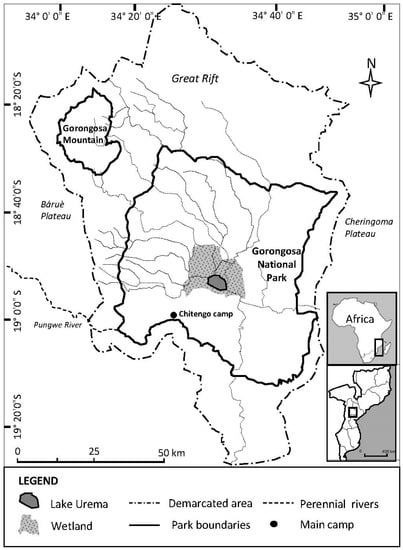 - Tinley, K.L. Framework of the Gorongosa Ecosystem. Ph.D. Thesis, University of Pretoria, Pretoria, South Africa, 1977. [Google Scholar]