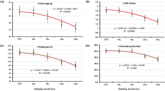 The relationship between (A) final fish weight (Wt56; g), (B) specific growth rate (SGR; %g/day), (C) weight gain %, and (D) feed intake (g feed/fish) of P. hypophthalmus exposed to different salinity levels for 56 days as described by second-order polynomial regression equations.