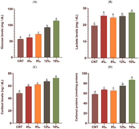 A panel of stress markers: (A) blood glucose (mg/dL), (B) lactate (mg/dL), (C) cortisol (ng/dL), and (D) liver carbonyl protein concentrations (nmol/mg protein) of P. hypophthalmus exposed to different salinity levels for 56 days. Data represent three replicates per group with means ± standard error (S.E.) (n = 6). The CNT (control) group and other experimental groups were compared by one-way ANOVA analysis followed by Duncan’s Multiple Range test. Bars assigned with different letters are significantly different (p < 0.05).