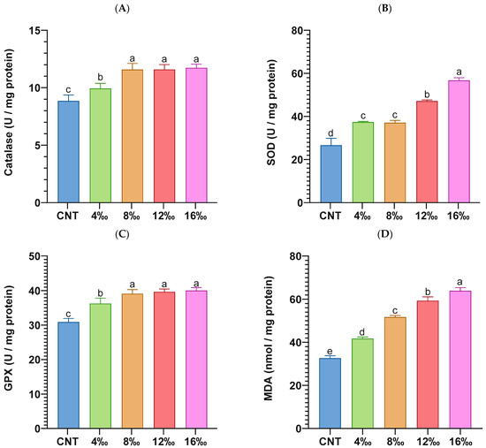A panel of liver oxidative stress biomarkers: (A) catalase enzyme (CAT; U/mg protein), (B) superoxide dismutase enzyme (SOD; U/mg protein), (C) glutathione peroxidase enzyme (GPX; U/mg protein), and (D) malondialdehyde concentrations (MDA; nmol/mg protein) of P. hypophthalmus exposed to different salinity levels for 56 days. Data represent three replicates per group with means ± standard error (S.E.) (n = 6). The CNT (control) group and other experimental groups were compared by one-way ANOVA analysis followed by Duncan’s Multiple Range test. Bars assigned with different letters are significantly different (p < 0.05).