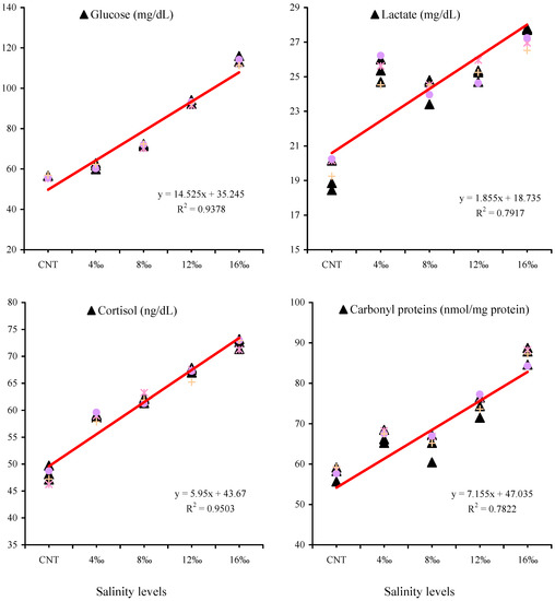 The relationships between blood glucose (mg/dL), lactate (mg/dL), cortisol (ng/dL), and hepatic carbonyl proteins (nmol/mg protein) of P. hypophthalmus juveniles exposed to different salinity levels for 56 days are presented in Figure 4. The second-order polynomial regression relationships (Figure 4) showed proportional effects of water salinities on blood glucose, lactate, cortisol, and hepatic carbonyl proteins, where R2 values are 0.9378, 0.7917, 0.9503, and 0.7822, respectively. Moreover, these linear relationships (Figure 4) indicate that salinity stress led to gradual increases in glucose, lactate, cortisol, and carbonyl protein values as salinity levels increased.