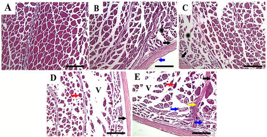 Representative photomicrographs in dorsal muscular tissues of P. hypophthalmus (H and E stain) (scale bar = 50 μm) exposed to different degrees of salinity (4, 8, 12, and 16‰) for 56 days. (A) control, (B) 4‰ salinity, (C) 8‰ salinity, (D) 12‰ salinity, and (E) 16‰ salinity. The muscular tissues showed normal striation and histologic structure (A) a focal separation between dermis and muscle (arrows) and mild atrophy in the subcutaneous muscle bundle (asterisk) (B,C), and degeneration and atrophy of muscle bundles, separation of the dermis (black arrow), vacuums (V) in the muscle layer, hyalinization of myotomes (red arrows), splitting and vacuolization of muscle fibers (blue arrows), and thickening of fibrous tissues separating muscle bundles (yellow arrow) (D,E).