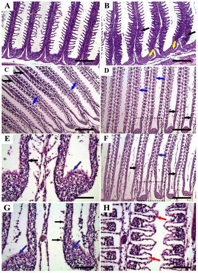 Representative photomicrographs in the gills of P. hypophthalmus (H and E stain, scale bar = 200 μm, and scale bar = 50 μm for E, G, and H) exposed to different degrees of salinity (4, 8, 12, and 16‰) for 56 days. (A) control, (B) 4‰ salinity, (C) 8‰ salinity, (D,E) 12‰ salinity, and (F–H) 16‰ salinity. Figure 7E is a higher magnification of dotted rectangle in Figure 7D, meanwhile Figure 7G,H is a higher magnification of dotted rectangle in Figure 7F. Gill tissues showed normal histologic limits of central venous sinus, primary and secondary lamellae (A), epithelial hyperplasia (black arrows) and congestion of primary lamellar blood capillaries (yellow arrows) (B), epithelial hyperplasia and fusion (black arrow) with lamellar epithelial lifting and edema (blue arrows) (C), marked epithelial hyperplasia and fusion (black arrows) and marked edema and epithelial lifting (blue arrows) (D,E), and complete rupture for the epithelial layer (black arrows), marked hyperplasia in chloride and mucous cells (yellow arrow), and clubbed tips of the secondary lamellae (red arrows) (F–H).