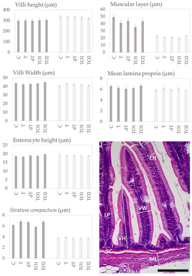 Quantitative measures during histomorphology analyses of rainbow trout gut. Experimental diets: C—control (no fishmeal replacement); T—50% fishmeal replacement with Tenebrio molitor; dT—50% fishmeal replacement with partially defatted Tenebrio molitor; TO1—T diet supplemented with 3.09% of omega–3-enriched algal oil; TO2—T diet supplemented with 7.24% of algal oil. Grey bars—distal intestine measures; striped bars—pyloric caeca measures. Values expressed as mean ± standard error of the mean (SEM; n = 4 tanks per diet). Microphotograph representative of measures for the gut: villi height (VH), villi width (VW), enterocyte height (EH), stratum compactum (SC), muscular layer width (ML), lamina propria width (LP). Scale bar = 100 µm.