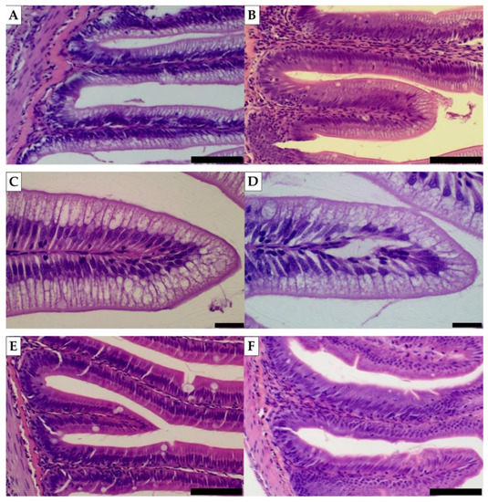 Visual example of the histomorphology qualitative analyses carried out in rainbow trout intestine. Pictures (A,B) (distal intestine), with (E,F) (pyloric caeca) are examples of the degree of inflammatory infiltration and were taken at 100× magnification, scale bars = 50 µm. Pictures (C,D) (distal intestine) are examples of the degree of vacuole loss and were taken at 400× magnification, scale bars = 10 µm. Pictures on the left represent a negative level (−) of the variables, while pictures on the right represent a low level (+).