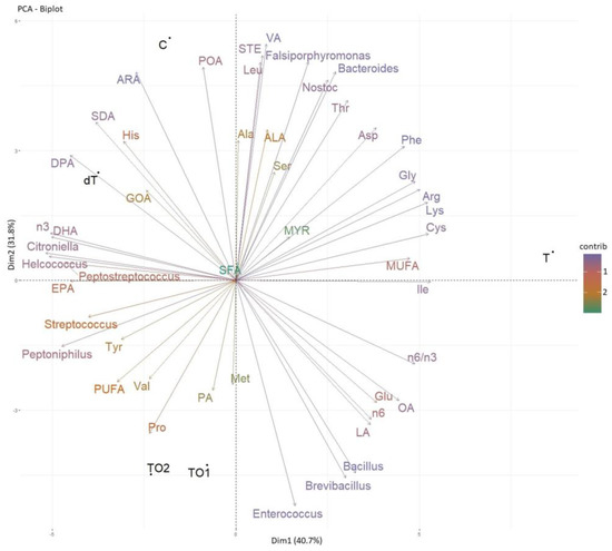 Principal Component Analysis of main distal intestine content microbiota genus of rainbow trout vs. feed composition (amino acids and fatty acids). Experimental diets: C—control (no fishmeal replacement); T—50% fishmeal replacement with Tenebrio molitor; dT—50% fishmeal replacement with partially defatted Tenebrio molitor; TO1—T diet supplemented with 3.09% of omega–3-enriched algal oil; TO2—T diet supplemented with 7.24% of algal oil. Acronyms used for amino acids and fatty acids follow the same key as Table 2 and Table 3.