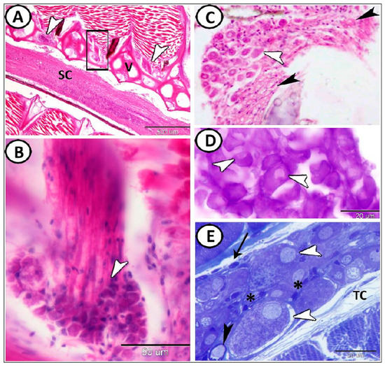 Spinal ganglia in molly fish. (A,B): Spinal ganglia (arrowheads) between the vertebrae (V), and over the spinal cord (SC). Note that image (B) is a higher magnification of the boxed area in (A). (Hematoxylin and Eosin (HE)). (C) Cell bodies of the neurons (white arrowhead) are close together and surrounded by nerve fibers (black arrowheads) (HE). (D) The neurons (white arrowheads) are positive for cresyl violet. (E) Semithin section stained with toluidine blue showed neurons contained Nissl’ granules (white arrowheads) surrounded by small nuclei (asterisks) of the flattened satellite cells. Some myelinated nerve fibers were observed (black arrowhead). Note the presence of telocytes (TC) and some immune cells (arrow).