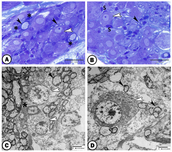 Semithin section and ultrastructure of ganglia. (A,B) Semithin section stained with toluidine blue showing the structure of the spinal ganglia that contained large neurons (white arrowheads) and nerve fibers (black arrowheads). Note the presence of Schwann cells (asterisks) and satellite glia cells (S). (C) TEM images show oligodendrocytes (white arrowheads) that possess a large round euchromatic nucleus tending to be eccentrically located in the cytoplasm, and myelinated nerve fibers (black arrowhead). Note the surrounding satellite cells (asterisk). (D) TEM images showing neurons (white arrowhead) filled with Nissl’s granules. Note the surrounding myelinated nerve fibers (black arrowhead).