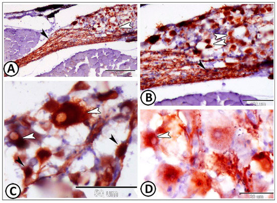 Additionally, the macrophages expressed CD68 that were distributed around the ganglia of the kidney (Figure 13A) and ovary (Figure 13B). On the other hand, the neurons and nerve fibers in the ganglia around the trunk kidney expressed Ach (Figure 13C,D). Furthermore, the ganglia around the head kidney showed positive expression of Iba1 in microglia and macrophages around the ganglia (Figure 14D). Most ganglion cells and nerve fibers in the DRG, autonomic, and vestibular ganglia showed moderate to strong immunoreactivity for S-100 protein (Figure 15).