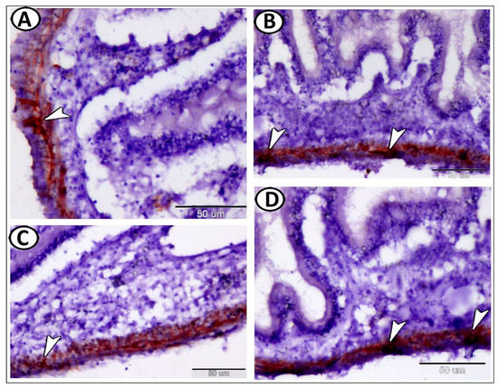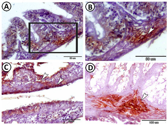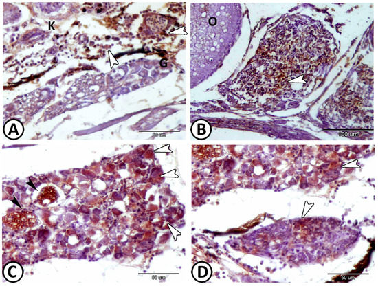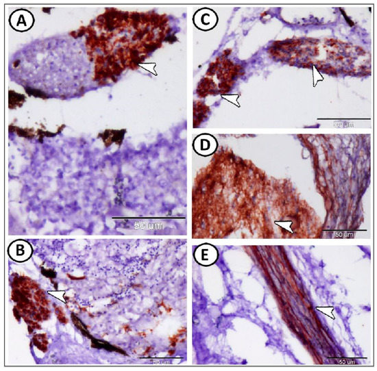Sections of fish were prepared for immunohistochemical analysis using an UltraTek HRP Anti-Polyvalent (DAB) Staining System (ScyTek Laboratories, West Logan, UT, USA, AMF080). The sections were deparaffinized with xylene, rehydrated in graded ethanol, and washed with distilled water. The sections were heated for 10 min in a sodium citrate buffer (0.01 M, pH 6.0) to increase epitope exposure. The sections were cooled at room temperature for 30 min and washed with PBS. The endogenous peroxidase activity was quenched with 3% H2O2 in distilled water for 15 min at RT followed by washing with PBS (2 × 5 min). The sections were blocked with the blocking solution of the kit for 5 min at RT. The sections were incubated overnight at 4 °C with the diluted (1:100) primary antibodies against S100 protein (Z0311, Dako, Glostrup, Denmark), rabbit polyclonal anti-CD3 (1:200; Abcam, Cambridge, UK, ab828), mouse monoclonal anti-CD68 (1:100; Santa Cruz, sc-17832), mouse monoclonal anti-Olig2 (1:100; Santa Cruz, Dallas, TX, USA, sc-515947(, rabbit polyclonal Nicotinic Acetylcholine R alpha 7 NACHRA7 (1:100; ABclonal, Wuhan, China, A7844), and the polyclonal glial fibrillary acidic protein (GFAP) (PA5-16291, Thermo Fisher Scientific, Waltham, MA, USA). In parallel, tissue specimens, in which S100 protein primary antibody was omitted and replaced with buffer, served as negative controls (Figures S1 and S2). Sections were rinsed (three times and 5 min each) with PBS and were incubated for 15 min with the secondary Ultra Tek HRP Anti-polyvalent antibody (goat anti-mouse, rat, rabbit and guinea pig IgG) purchased from Scy Tek, (TX, USA). Following that, the slides were washed three times for 3 min each with a wash buffer, and the tissues were incubated with the HRP for 15 min and then washed three times for 3 min each with a wash buffer. The visualization of the reaction was carried out with Diaminobenzodiazibin DAB chromogen diluted with DAB substrate (provided within the same Scy Tek Detection kit) according to the manufacturer protocol for 10–15 min until the desired staining was achieved and counterstained with Harris hematoxylin and mounted with mounting media, DPX.