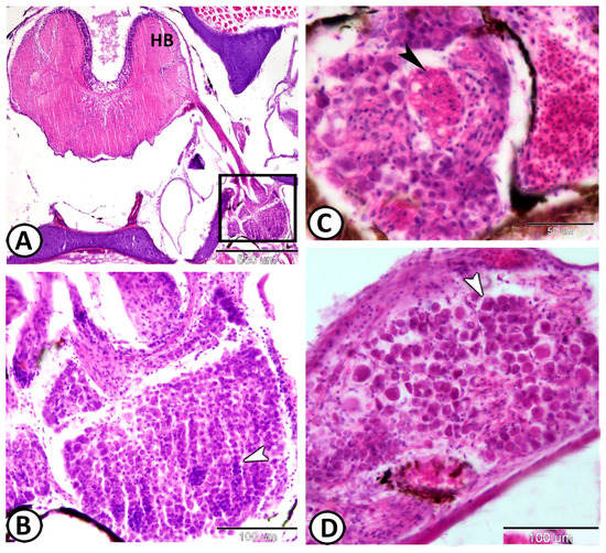 Vestibular ganglia stained with HE. (A) Ganglia (boxed area) in the hindbrain (HB). (B) A higher magnification of the boxed area in (A) shows a large cluster of neuronal cell bodies in the head of molly (arrowhead). (C,D) The nerve fibers (black arrowhead) are arranged in between the neurons (white arrowhead).