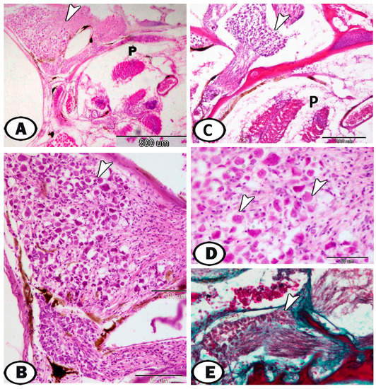 Cervical ganglia around the pseudobranch. (A–C) The cervical ganglia (arrowheads) are observed around the pseudobranch (P) (HE). (D) Higher magnification showed the random distribution of neurons (arrowheads) (HE). (E) Ganglia stained with Crossmon’s trichrome showed neurons and peripherally situated nerve fibers (arrowhead).