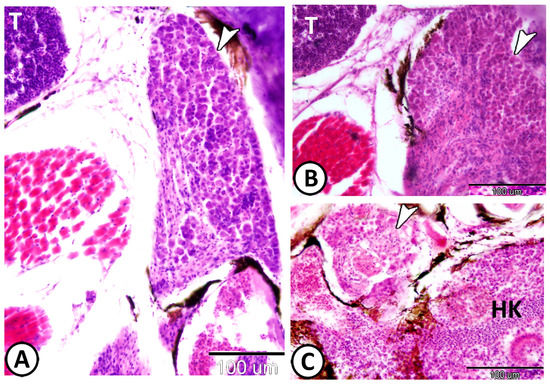 Cervical ganglia around thymus and head kidney stained with HE. (A,B) The cervical ganglia (arrowhead) are observed around the thymus (T). (C) The ganglia (arrowhead) beside the head kidney (HK).