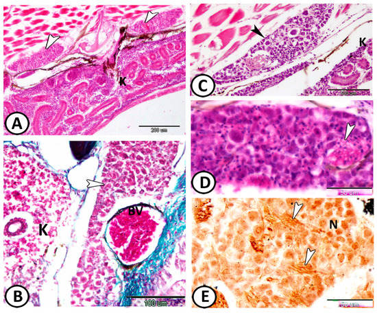 The ganglia along the trunk kidney. (A,B) The ganglia (arrowheads) are along the trunk kidney (K). Note the presence of a large blood vessel (BV) (HE, Crosmmon’s trichrome, respectively). (C,D) These ganglia exhibit cell bodies (black arrowhead) more widely spaced than in spinal and cranial ganglia because of the presence of numerous neurites (white arrowhead) in between. (E) The neurons (N) and nerve fibers (arrowheads) showed a positive reaction to the silver stain.