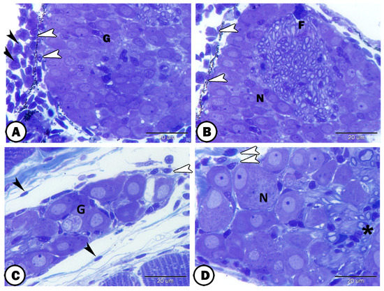 Semithin section of the ganglia in association with immune cells. (A,B) Ganglia (G) were observed in neighboring to lymphocytes (white arrowheads) and macrophages (black arrowheads). These ganglia consisted of neurons (N) and nerve fibers (F). (C) Telocytes (black arrowheads) and dendritic cells (white arrowhead) are observed around the ganglia (G). (D) Dendritic cells (arrowheads) are seen in close contact with the neurons (N). Note the satellite glia cells (asterisk).