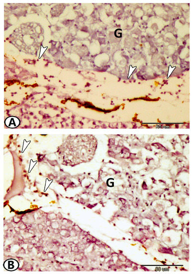 Expression of CD3. (A,B) T-lymphocytes (arrowheads) expressed CD3 around the ganglia (G).