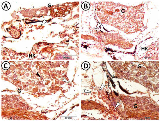 Expression of Iba1 in microglia of the ganglia and macrophages. (A,B) The ganglia (G) around the head kidney (HK) showed macrophages (arrowheads) that expressed Iba1, which were distributed around the neurons in the ganglia. (C,D) Higher magnifications showed positive expression of Iba1 in microglia (black arrowhead) and macrophages (white arrowheads) around the ganglia (G).