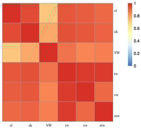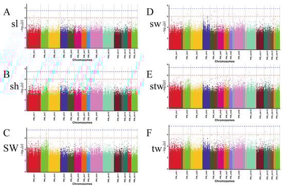 The GWAS of the 6 growth-related traits was conducted using TASSEL3.0 with 4,937,162 SNPs and 60 samples. A total of 45 genome-wide significant SNPs (−log10 p > 6) were identified across all traits, located on 1–14 (Figure 3 and Table S1), with 7 of them significant for multiple traits. These SNPs were mainly located on chromosomes 1, 2, 3, 4, 5, 6, 7, 9, 10, 11, 14. Among them, PIN_chr3_76865070 and PIN_chr3_76865288 were significant for sl, sh, sw, and tw, with SNP effects ranging from 0.27 to 0.32. PIN_chr10_36697210 and PIN_chr12_8906589 were significant for stw and tw, with SNP effects of 0.24, 0.34, and 0.30, respectively. PIN_chr2_43686383 and PIN_chr7_35952421 were significant for sw and tw, with SNP effects of 0.23 and 0.30, respectively. Finally, PIN_chr2_50316499 was significant for stw and tw, with SNP effects of 0.19 and 0.18, respectively. Some markers or SNPS are associated with two or more traits at the same time, indicating that there may be a certain degree of genetic correlation between traits.