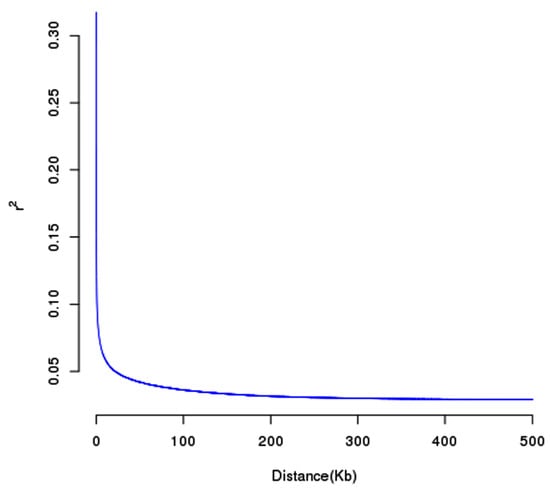 Previous investigations have concentrated on the genetic mapping and trait location examination of P. fucata. For instance, genetic linkage maps were constructed utilizing 230 and 189 markers, including 15 and 10 microsatellites, respectively []. Although preliminary, the genetic maps can be employed for genome-wide scanning of QTLs. Li et al. using restriction-site associated DNA sequencing (RAD-seq), a genetic mapping and QTL analysis of growth-related traits was conducted. Subsequently, single-marker analysis and a non-parametric mapping Kruskal–Wallis (KW) test were employed to identify thirty-nine QTL-peak loci for seven growth-related traits []. These previous studies employed AFLP, SSR, or RAD-seq techniques to identify markers. One shared characteristic among these techniques is the identification is the limited number of detected markers. In 2015, Brondum and associates [] showed that the use of QTL markers taken from whole-genome sequence data augmented the dependability of genomic forecasts. Likewise, Bentley [] emphasized the need for whole-genome resequencing data in reference groups to obtain abundant genetic information and gene resources. Here, LD analysis revealed a rapid LD decay in a set of 60 samples of P. fucata, with an r2 value falling below 0.1 within 1 kb, which indicated that LD levels were low in the investigated populations. Consequently, markers of high density are indispensable for capturing markers in close proximity to the actual causal mutations in this species.