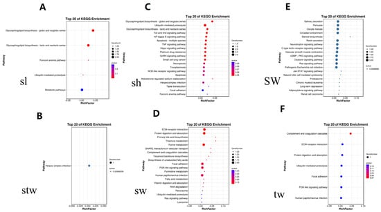 As presented in Figure 4, the squared allele frequency correlation (r2) declined drastically in the experimental group, with the overall mean at a distance approximately 80 kb. The KEGG database revealed the top 20 enriching pathways, which are mainly linked to the glycosphingolipid biosynthesis-globo and the isoglobo series, glycosphingolipid biosynthesis-lacto and neolacto series, ECM–receptor interaction, protein digestion and absorption, purine metabolism, the Toll and lmd signaling pathway, and the TNF signaling pathway, as illustrated in Figure 5 and beyond. A total of 165 genes were identified across all significant SNPs of the six traits, with a subset of these genes presented in Table S2.