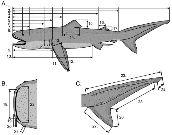 Morphometric measurements used in this study. (A). Body measurements. (B). Head measurements. (C). Caudal fin measuresments. 1. Body length; 2. Precaudal length; 3. Presecond dorsal length; 4. Prefirst dorsal length; 5. Head length; 6. Prebranchial length; 7. Prespiracular length; 8. Preorbital length; 9. Prepectoral length; 10. Prepelvic length; 11. Pectoral anterior margin length; 12. Pectoral height; 13. Pectoral base length; 14. First dorsal base length; 15. First dorsal height; 16. Second dorsal base length; 17. Second dorsal height; 18. Internarial distance; 19. Prenarial length; 20. Preoral length; 21. Eye length (horizontal); 22. Mouth width; 23. Dorsal caudal margin length; 24. Terminal caudal lobe length; 25. Upper postventral caudal margin length; 26. Lower postventral caudal margin length; 27. Preventral caudal margin length. Illustrations are after Compagno [5] and Ebert and Dando [9].