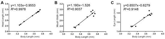 Linear regressions of selected log10-transformed Megachasma pelagios head measurements against log10-transformed total body length. (A). Head length. (B). Mouth width; (C). Eye length.