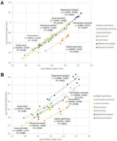 Linear regressions of selected log10-transformed head measurements of lamniform sharks against log10-transformed total body length. (A). Head length. (B). Mouth width.