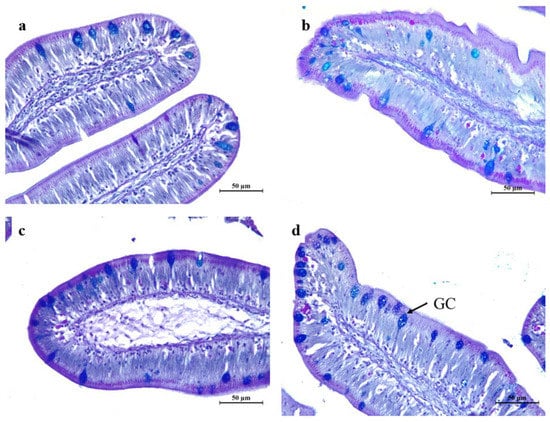 Representative histological images of Alcian blue, periodic acid and Schiff reagent stained cross-sections of proximal intestine tissue depicting the goblet cell distribution of the intestine cross-sections (×40) of olive flounder, Paralichthys olivaceus, fed the graded levels of functional immunostimulant mixture included diets for 12 weeks. (a)—control; (b)—HB0.5; (c)—HB1.0, 1.0%; (d)—HB1.5; and GC—Goblet cell. Abbreviations: control, a basal diet; HB0.5, HB1.0 and HB1.5 are 0.5, 1.0 and 1.5% functional immunostimulant mixture (Rovimax® HB Ultra) supplemented diets.