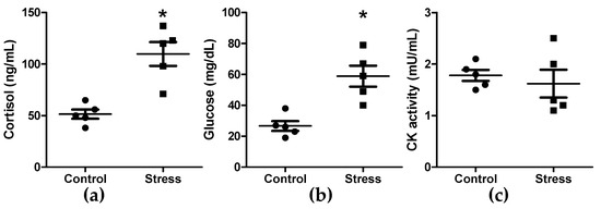 Blood plasma cortisol and glucose levels significantly increased after five days of exposure to high temperature in the stressed group (Figure 1a,b). No significant differences in plasma creatine kinase activity were observed between the control and stressed groups (Figure 1c).