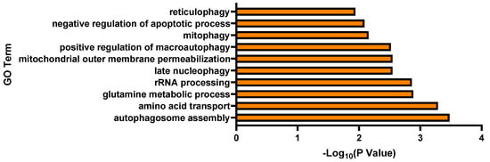 To analyze the effect of high-temperature stress on global gene expression, we performed RNA-Seq analysis. A total of 383,796,290 trimmed reads were mapped in the rainbow trout reference genome, covering 85.9% of its size. Principal component analysis (PCA) revealed a high similarity in the biological replicates (Supplementary Figure S1). Differential expression analysis revealed that 293 genes were upregulated and 119 genes were downregulated under high-temperature stress (Supplementary Table S2). To analyze the biological role of the DEGs, GO term enrichment analysis was performed with the DAVID database. The upregulated DEGs were enriched in biological processes (BPs), such as autophagosome assembly, amino acid transport, and glutamine metabolic process (Figure 3). Gene Ontology (GO) terms for upregulated genes were assigned to RNA binding and nucleoplasm for molecular function (MF) and cellular component (CC), respectively (Supplementary Tables S3 and S4). Among KEGG pathways, mitophagy—animal, autophagy—animal, and spinocerebellar ataxia were over-represented (Table 1).