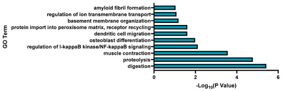 The downregulated differentially expressed genes (DEGs) were enriched in biological processes (BPs) such as digestion, proteolysis, and muscle contraction (Figure 4). The Gene Ontology (GO) terms for downregulated genes were assigned to serine-type endopeptidase activity and cytosol for molecular function (MF) and cellular component (CC), respectively (Supplementary Tables S5 and S6). The KEGG pathways assigned to the differentially expressed genes (DEGs) included pancreatic secretion, protein digestion and absorption, and adrenergic signaling in cardiomyocytes (Table 2).