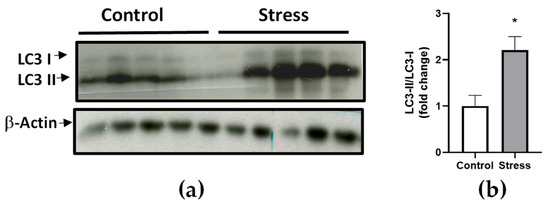 For real-time RT-qPCR validation, we selected four upregulated genes associated with autophagy (mapk10, bnip3, atg9a, and raf1) and four downregulated genes related to protein digestion (prss1, cela1, ctrb2, and prss2) (Supplementary Figure S2). The gene expression fold-changes measured by these two methods (RNA-Seq and RT-qPCR) were highly correlated, with a significant R2 value of 0.86 (p-value, 0.0001). Finally, to verify the presence of autophagy in skeletal muscle, we analyzed the LC3-II/LC3-I levels. We found that LC3-II protein was significantly upregulated in the stressed group (Figure 5a), measuring 2.1-fold that of control conditions (Figure 5b).