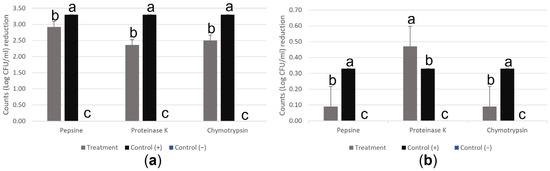 Changes in antibacterial activity in the co-culture challenge of the postbiotic product after enzyme treatment: (a) changes in antibacterial activity against A. salmonicida subsp. salmonicida; (b) changes in antibacterial activity against Y. ruckeri. Bars represent the means of count (log CFU/mL) reduction (n = 3). Bars with different superscripts are significantly different (p < 0.05) from each other. Error bars express SE.