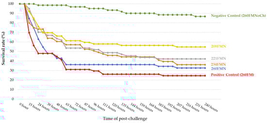 At 10 days post-challenge, survival rate was significantly lower in the positive control group (260FM), compared to the negative control (260FMNoCh). All groups in which the diets incorporated nucleotides showed higher survival rates than the positive control group during the post-challenge period (Figure 3). Fifteen hours post-challenge, a significantly (p < 0.05) higher survival rate compared to the positive control group (69.72 ± 18.08%) was achieved with 221FMN (95.00 ± 10.00%) and 208FMN (91.98 ± 9.52%), while survival rate in these groups at that time was not statistically inferior to the negative control group (86.76 ± 5.27%).