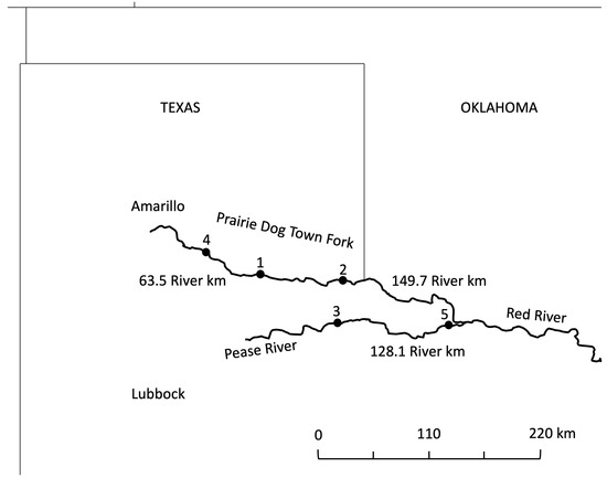 Female Red River pupfish were collected from five different locations of the Red River (Figure 1; Table 1). Populations were selected based on the fish community composition outlined in Ruppel [12] to test the effects of community complexity on antipredator response intensity [15]. Red River pupfish in populations 1 and 2 co-occurred with only one species, the similarly sized small-bodied plains killifish, and these populations were ranked as having a low predation risk (Table 1). Red River pupfish in populations 3 and 4 co-occurred with two to three other species but no large predators and were ranked as having a moderate predation risk (Table 1). Red River pupfish population 5 was classified as having a high predation risk due to a complex community structure including native piscivorous fishes such as the largemouth bass (Micropterus salmoides), orange spotted sunfish (Lepomis humilis), western mosquitofish, and red shiner (Cyprinella lutrensis) (Table 1). Distances between adjacent populations ranged from 65.3 to 149.7 river km (Figure 1).