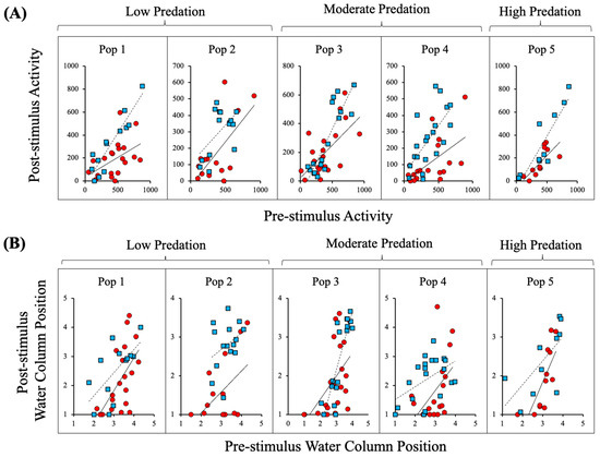 Fish that did not exhibit normal behavior during the pre-stimulus observation period were excluded from analyses because abnormal behavior would not provide a valid assessment of response to the test stimuli. We excluded one hyperactive fish that crossed more than 1300 lines during the pre-stimulus period (>4 SD from the mean). We also excluded eight trials where fish did not move within at least one of the five 1 min intervals during the pre-stimulus observation period. Fish that were inactive during the pre-observation period may have been in ill-heath or not well-acclimated to the test arena, either of which made the test subjects unsuitable for measuring behavioral responses to the perception of risk [16]. We performed data analyses with both the full and reduced data sets. There were no differences in the outcomes from the two sets of analyses, and thus we report the analyses based on the reduced data set (full data set analyses are available from the authors upon request). Sample sizes for each population are provided in Table 1. Data were analyzed using analysis of covariance (ANCOVA; JMP Pro version 17.0 software, JMP Statistical Discovery LLC, Cary, NC, USA), with Cue (alarm cue or water) and Population (1, 2, 3, 4, or 5) as categorical predictors and Pre-stimulus behavior (activity or vertical position) as a covariate. Block effects were included in the initial models but were not significant [15] and are not included in the results presented here. Significant effects of alarm cue were revealed either by a significant treatment effect of the cue or by a significant interaction of Cue × Pre-Stimulus behavior.