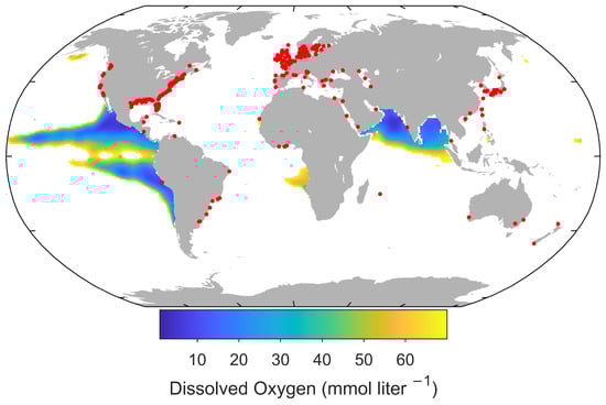 Hypoxic areas (red dots; O < 63 O) and oxygen below 70 at depth of 200 m (colorbar). Dissolved oxygen was obtained from the World Ocean Atlas 2018 [], and hypoxic areas were extracted from Diaz and Rosenberg 2008 [].