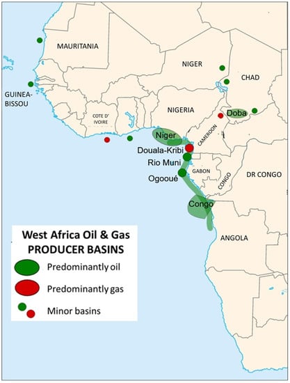 - Raminagrobis, Petroleum Regions—West Africa map-fr.svg. 2008. Available online: https://commons.wikimedia.org/wiki/File:Petroleum_regions_-_West_Africa_map-fr.svg#file (accessed on 22 May 2023).