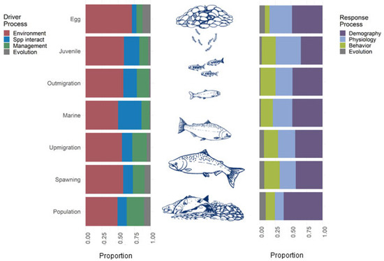 Salmon life stages are associated with distinct physical and biological needs, and will likely respond differently to future climate forcing. Furthermore, life stages may occur in completely different spatial regions, require different methods of study, and are tractable for answering different questions. We compared the relative frequency of papers studying different life stages. The juvenile rearing stages in freshwater (33%) and saltwater (28%) were the stages that were addressed most commonly. Migration stages were highlighted in 10% and 14% of the papers for the downstream and upstream directions, respectively. Egg, spawning and population level analyses constituted 6%, 7%, and 9% of the database, respectively. In all stages, environmental factors were the most prevalent driver, but the relative proportion of species interactions (more common in marine studies) and drivers affected by human activities (more common in upstream migration and population-level analyses) depended on the life stage (Figure 2). Among responses, demographic processes were generally most prevalent, but the relative proportion of physiological and behavioral processes varied by life stage (Figure 2).