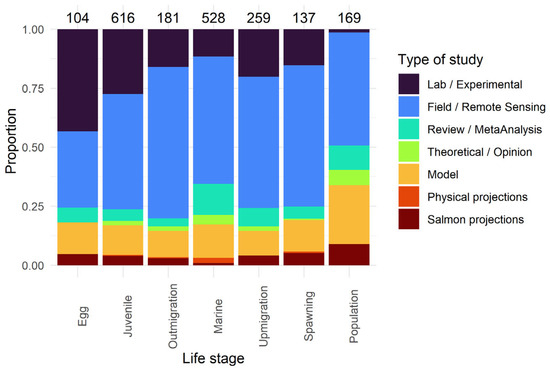 Study types also varied across life stages (Figure 3). The egg stage was most often studied experimentally. Field studies were most prevalent in research on the two migration stages and the spawning stage. The fewest models, reviews, and projections were performed on the egg and migratory stages. The marine stage had the highest percentage of reviews and meta-analyses, whereas theoretical work and projections of future salmon responses to climate change were most often completed at the population level.