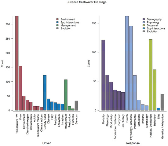 The number of papers covering the juvenile life stage that compared each type of driver (left) and each type of response (right). Colors reflect the process associated with each label.